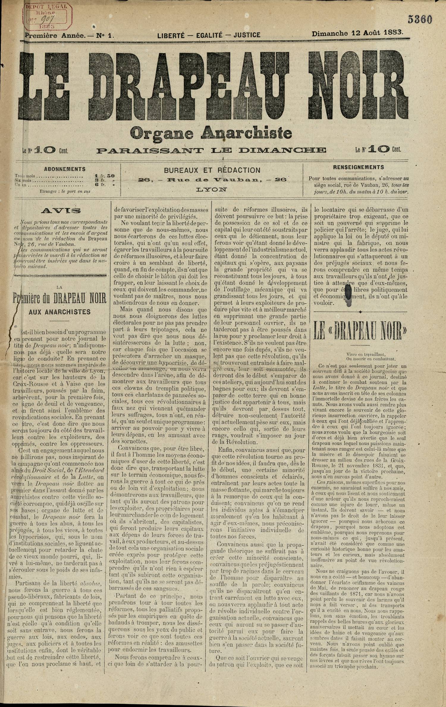 Le journal Le Drapeau noir, apparu en 1883, est l'une des premières publications du mouvement à utiliser le noir comme symbole. L’éditorial du premier numéro explique qu’ils se sont « inspirés de l’histoire locale de la ville de Lyon, car c’est sur les hauteurs de la Croix-Rousse et à Vaise que les travailleurs, poussés par la faim arborèrent, pour la première fois, ce signe de deuil et de vengeance et en firent ainsi l’emblème des revendications sociales[9]. » Le nom du groupe anarchiste londonien fondé en est Black International.
